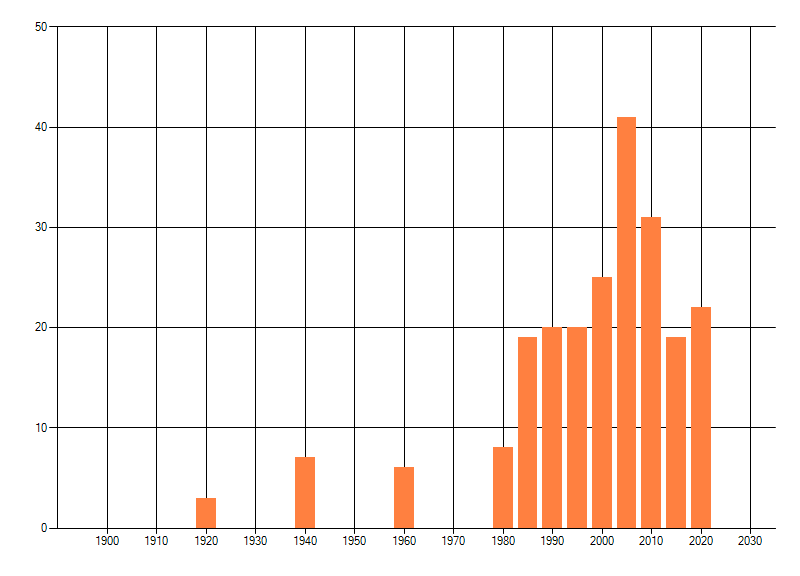 Het aantal atlasblokken (5x5 km) waarin de soort is gemeld binnen een periode van vijf jaar (vanaf 1980) of twintig jaar. Niet gecorrigeerd voor waarnemersinspanning en het aantal doorgegeven waarnemingen kan sterk variëren per periode, dus een trend in verspreiding kan hier niet direct uit worden afgelezen. Het opgegeven jaartal is het eerste jaar van de periode. Bron: gevalideerde waarnemingen uit de NDFF.
