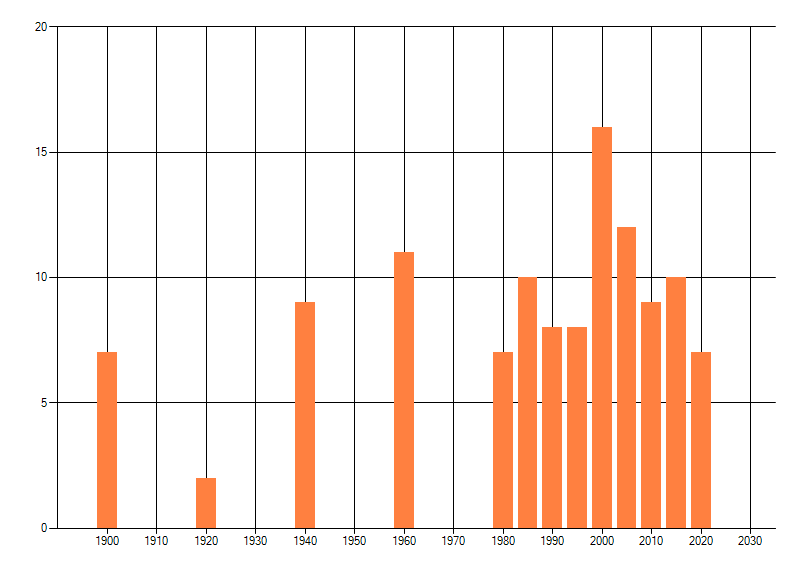 Het aantal atlasblokken (5x5 km) waarin de soort is gemeld binnen een periode van vijf jaar (vanaf 1980) of twintig jaar. Niet gecorrigeerd voor waarnemersinspanning en het aantal doorgegeven waarnemingen kan sterk variëren per periode, dus een trend in verspreiding kan hier niet direct uit worden afgelezen. Het opgegeven jaartal is het eerste jaar van de periode. Bron: gevalideerde waarnemingen uit de NDFF.