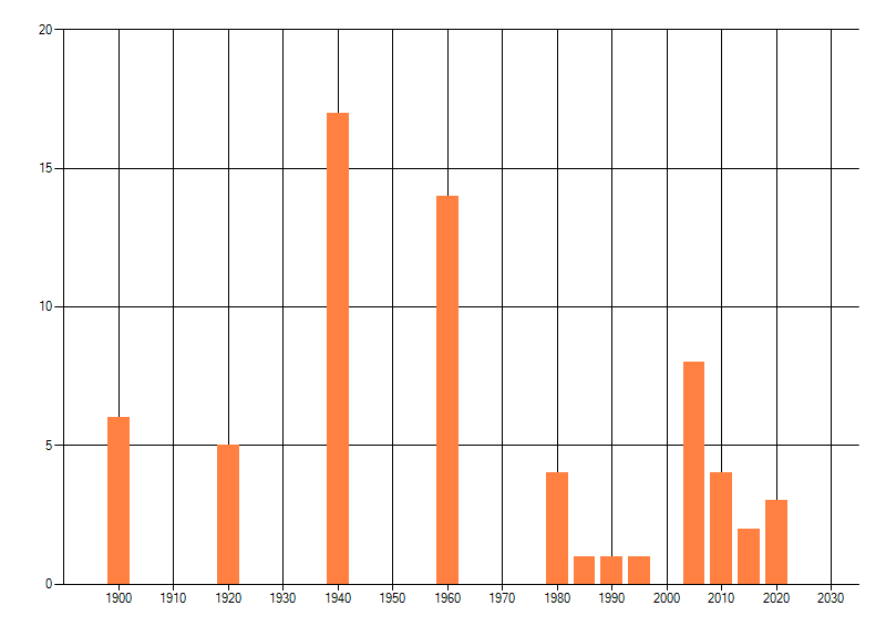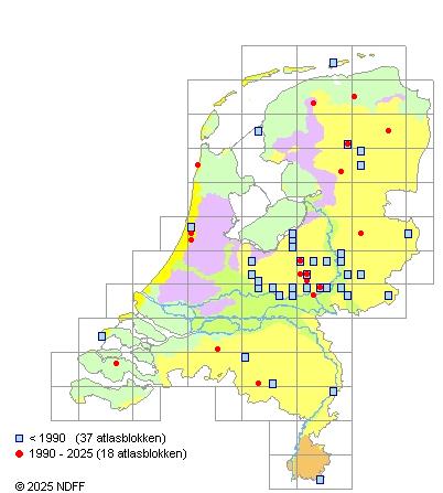 Het aantal atlasblokken (5x5 km) waarin de soort is gemeld binnen een periode van vijf jaar (vanaf 1980) of twintig jaar. Niet gecorrigeerd voor waarnemersinspanning en het aantal doorgegeven waarnemingen kan sterk variëren per periode, dus een trend in verspreiding kan hier niet direct uit worden afgelezen. Het opgegeven jaartal is het eerste jaar van de periode. Bron: gevalideerde waarnemingen uit de NDFF.