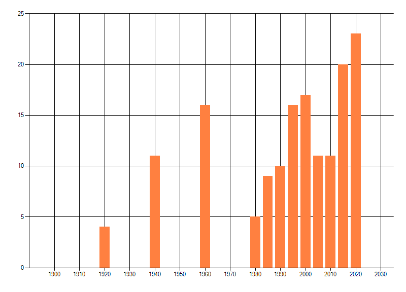 Het aantal atlasblokken (5x5 km) waarin de soort is gemeld binnen een periode van vijf jaar (vanaf 1980) of twintig jaar. Niet gecorrigeerd voor waarnemersinspanning en het aantal doorgegeven waarnemingen kan sterk variëren per periode, dus een trend in verspreiding kan hier niet direct uit worden afgelezen. Het opgegeven jaartal is het eerste jaar van de periode. Bron: gevalideerde waarnemingen uit de NDFF.