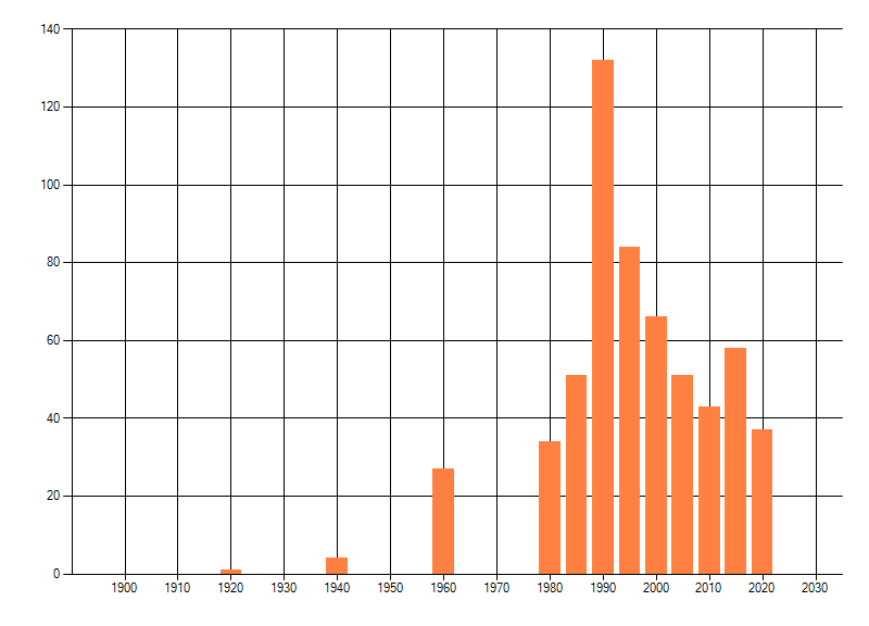 Het aantal atlasblokken (5x5 km) waarin de soort is gemeld binnen een periode van vijf jaar (vanaf 1980) of twintig jaar. Niet gecorrigeerd voor waarnemersinspanning en het aantal doorgegeven waarnemingen kan sterk variëren per periode, dus een trend in verspreiding kan hier niet direct uit worden afgelezen. Het opgegeven jaartal is het eerste jaar van de periode. Bron: gevalideerde waarnemingen uit de NDFF.