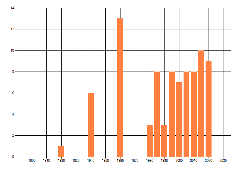 Het aantal atlasblokken (5x5 km) waarin de soort is gemeld binnen een periode van vijf jaar (vanaf 1980) of twintig jaar. Niet gecorrigeerd voor waarnemersinspanning en het aantal doorgegeven waarnemingen kan sterk variëren per periode, dus een trend in verspreiding kan hier niet direct uit worden afgelezen. Het opgegeven jaartal is het eerste jaar van de periode. Bron: gevalideerde waarnemingen uit de NDFF.
