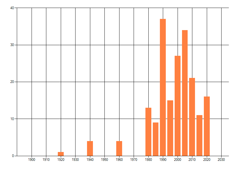 Het aantal atlasblokken (5x5 km) waarin de soort is gemeld binnen een periode van vijf jaar (vanaf 1980) of twintig jaar. Niet gecorrigeerd voor waarnemersinspanning en het aantal doorgegeven waarnemingen kan sterk variëren per periode, dus een trend in verspreiding kan hier niet direct uit worden afgelezen. Het opgegeven jaartal is het eerste jaar van de periode. Bron: gevalideerde waarnemingen uit de NDFF.