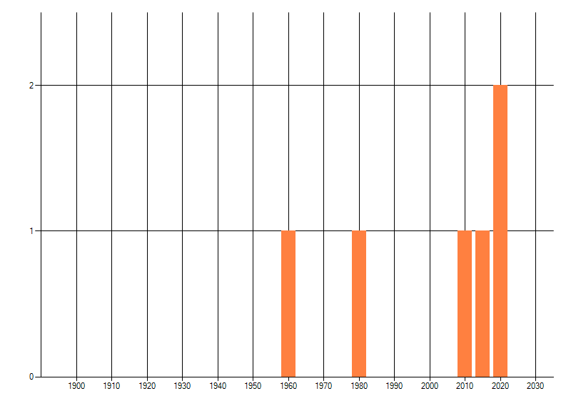 Het aantal atlasblokken (5x5 km) waarin de soort is gemeld binnen een periode van vijf jaar (vanaf 1980) of twintig jaar. Niet gecorrigeerd voor waarnemersinspanning en het aantal doorgegeven waarnemingen kan sterk variëren per periode, dus een trend in verspreiding kan hier niet direct uit worden afgelezen. Het opgegeven jaartal is het eerste jaar van de periode. Bron: gevalideerde waarnemingen uit de NDFF.