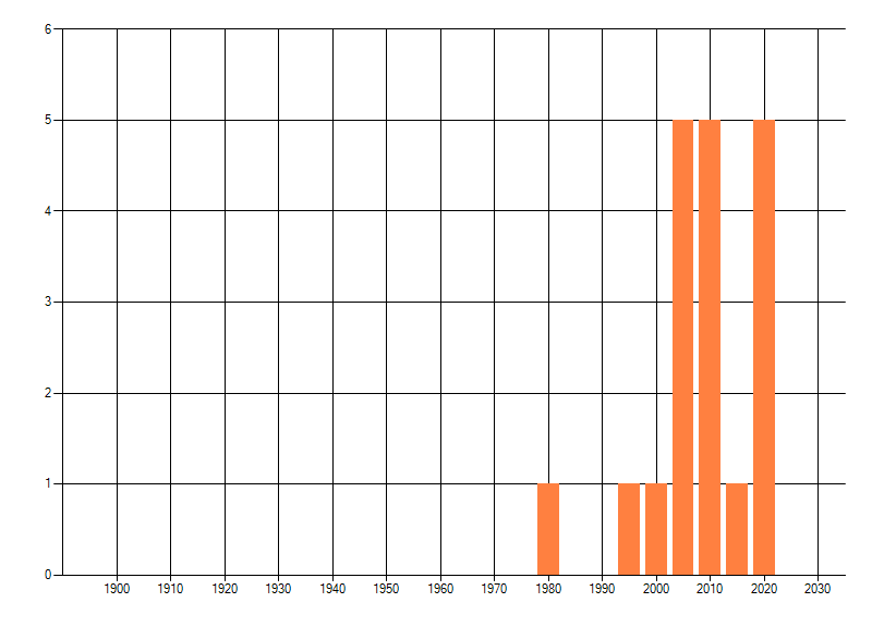 Het aantal atlasblokken (5x5 km) waarin de soort is gemeld binnen een periode van vijf jaar (vanaf 1980) of twintig jaar. Niet gecorrigeerd voor waarnemersinspanning en het aantal doorgegeven waarnemingen kan sterk variëren per periode, dus een trend in verspreiding kan hier niet direct uit worden afgelezen. Het opgegeven jaartal is het eerste jaar van de periode. Bron: gevalideerde waarnemingen uit de NDFF.