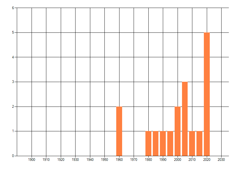 Het aantal atlasblokken (5x5 km) waarin de soort is gemeld binnen een periode van vijf jaar (vanaf 1980) of twintig jaar. Niet gecorrigeerd voor waarnemersinspanning en het aantal doorgegeven waarnemingen kan sterk variëren per periode, dus een trend in verspreiding kan hier niet direct uit worden afgelezen. Het opgegeven jaartal is het eerste jaar van de periode. Bron: gevalideerde waarnemingen uit de NDFF.