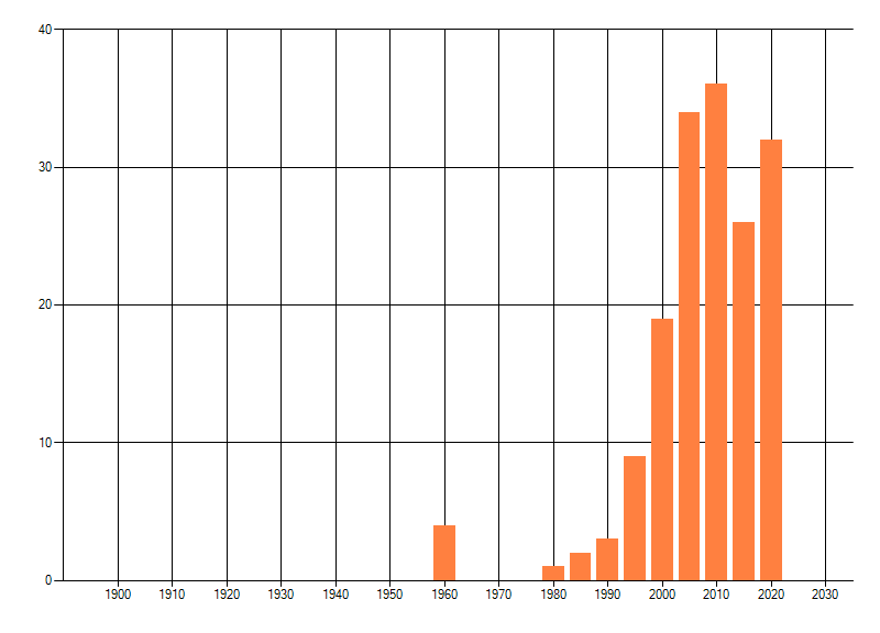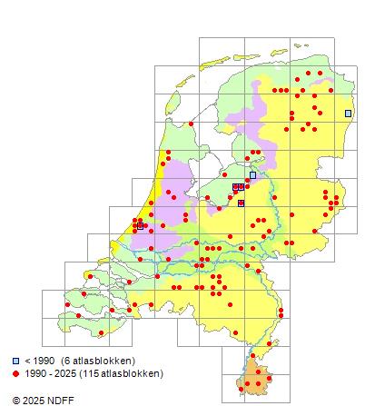 Het aantal atlasblokken (5x5 km) waarin de soort is gemeld binnen een periode van vijf jaar (vanaf 1980) of twintig jaar. Niet gecorrigeerd voor waarnemersinspanning en het aantal doorgegeven waarnemingen kan sterk variëren per periode, dus een trend in verspreiding kan hier niet direct uit worden afgelezen. Het opgegeven jaartal is het eerste jaar van de periode. Bron: gevalideerde waarnemingen uit de NDFF.