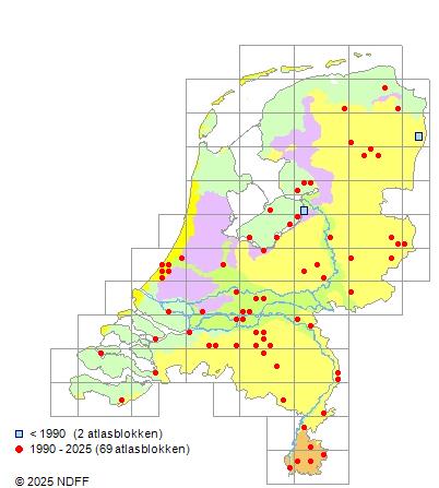 Het aantal atlasblokken (5x5 km) waarin de soort is gemeld binnen een periode van vijf jaar (vanaf 1980) of twintig jaar. Niet gecorrigeerd voor waarnemersinspanning en het aantal doorgegeven waarnemingen kan sterk variëren per periode, dus een trend in verspreiding kan hier niet direct uit worden afgelezen. Het opgegeven jaartal is het eerste jaar van de periode. Bron: gevalideerde waarnemingen uit de NDFF.