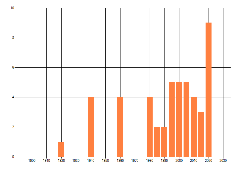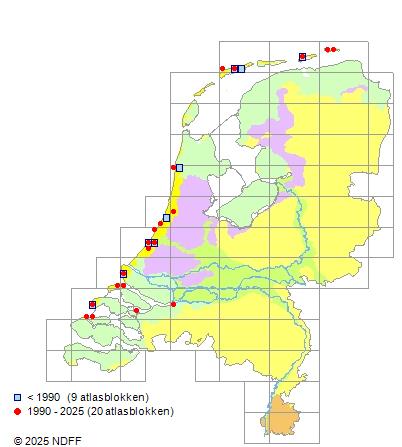 Het aantal atlasblokken (5x5 km) waarin de soort is gemeld binnen een periode van vijf jaar (vanaf 1980) of twintig jaar. Niet gecorrigeerd voor waarnemersinspanning en het aantal doorgegeven waarnemingen kan sterk variëren per periode, dus een trend in verspreiding kan hier niet direct uit worden afgelezen. Het opgegeven jaartal is het eerste jaar van de periode. Bron: gevalideerde waarnemingen uit de NDFF.