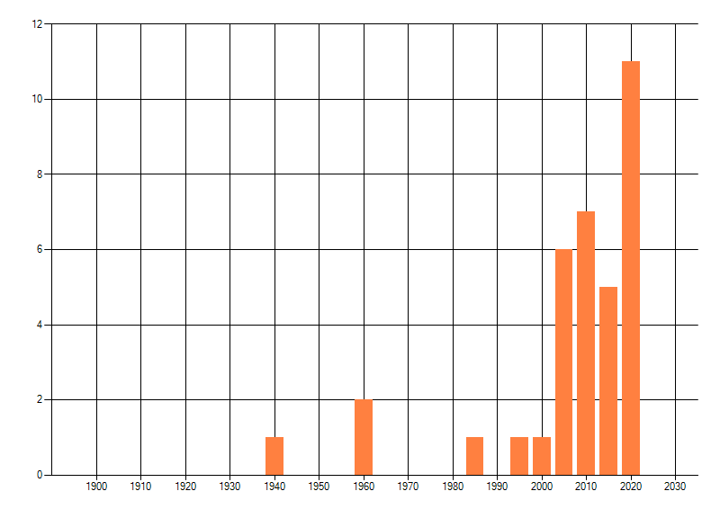 Het aantal atlasblokken (5x5 km) waarin de soort is gemeld binnen een periode van vijf jaar (vanaf 1980) of twintig jaar. Niet gecorrigeerd voor waarnemersinspanning en het aantal doorgegeven waarnemingen kan sterk variëren per periode, dus een trend in verspreiding kan hier niet direct uit worden afgelezen. Het opgegeven jaartal is het eerste jaar van de periode. Bron: gevalideerde waarnemingen uit de NDFF.