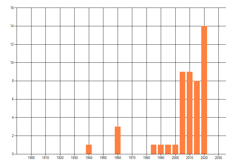 Het aantal atlasblokken (5x5 km) waarin de soort is gemeld binnen een periode van vijf jaar (vanaf 1980) of twintig jaar. Niet gecorrigeerd voor waarnemersinspanning en het aantal doorgegeven waarnemingen kan sterk variëren per periode, dus een trend in verspreiding kan hier niet direct uit worden afgelezen. Het opgegeven jaartal is het eerste jaar van de periode. Bron: gevalideerde waarnemingen uit de NDFF.