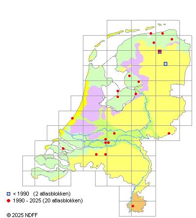 Het aantal atlasblokken (5x5 km) waarin de soort is gemeld binnen een periode van vijf jaar (vanaf 1980) of twintig jaar. Niet gecorrigeerd voor waarnemersinspanning en het aantal doorgegeven waarnemingen kan sterk variëren per periode, dus een trend in verspreiding kan hier niet direct uit worden afgelezen. Het opgegeven jaartal is het eerste jaar van de periode. Bron: gevalideerde waarnemingen uit de NDFF.