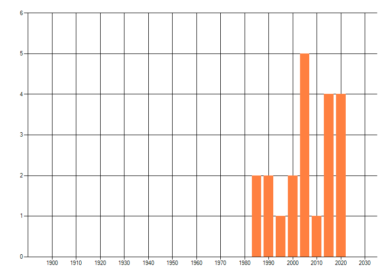 Het aantal atlasblokken (5x5 km) waarin de soort is gemeld binnen een periode van vijf jaar (vanaf 1980) of twintig jaar. Niet gecorrigeerd voor waarnemersinspanning en het aantal doorgegeven waarnemingen kan sterk variëren per periode, dus een trend in verspreiding kan hier niet direct uit worden afgelezen. Het opgegeven jaartal is het eerste jaar van de periode. Bron: gevalideerde waarnemingen uit de NDFF.