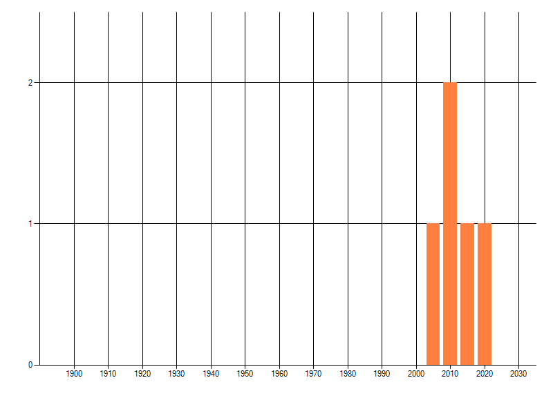 Het aantal atlasblokken (5x5 km) waarin de soort is gemeld binnen een periode van vijf jaar (vanaf 1980) of twintig jaar. Niet gecorrigeerd voor waarnemersinspanning en het aantal doorgegeven waarnemingen kan sterk variëren per periode, dus een trend in verspreiding kan hier niet direct uit worden afgelezen. Het opgegeven jaartal is het eerste jaar van de periode. Bron: gevalideerde waarnemingen uit de NDFF.