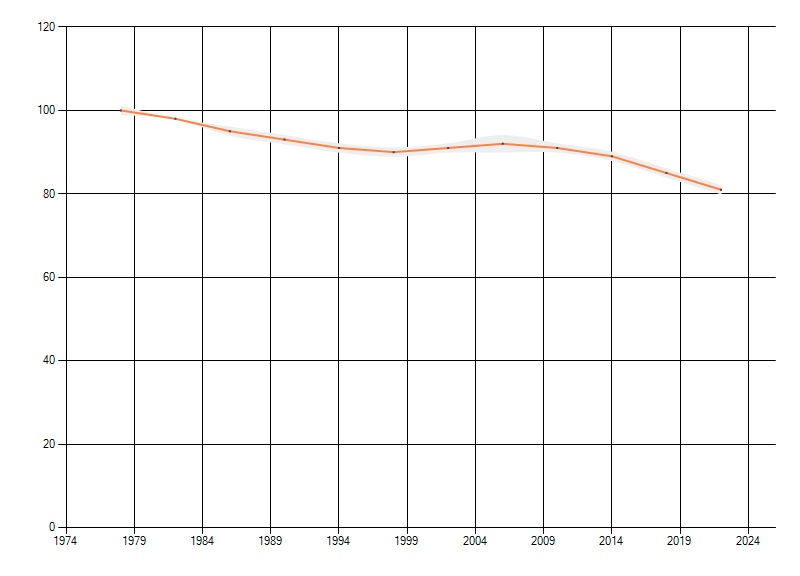 Gemiddelde trend van het aantal kilometerhokken waarin de soort voorkomt, weergegeven als indexcijfer (1975-1978 = 100).