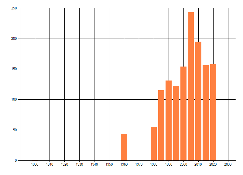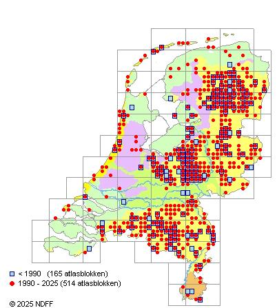 Het aantal atlasblokken (5x5 km) waarin de soort is gemeld binnen een periode van vijf jaar (vanaf 1980) of twintig jaar. Niet gecorrigeerd voor waarnemersinspanning en het aantal doorgegeven waarnemingen kan sterk variëren per periode, dus een trend in verspreiding kan hier niet direct uit worden afgelezen. Het opgegeven jaartal is het eerste jaar van de periode. Bron: gevalideerde waarnemingen uit de NDFF.