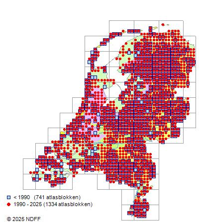 Het aantal atlasblokken (5x5 km) waarin de soort is gemeld binnen een periode van vijf jaar (vanaf 1980) of twintig jaar. Niet gecorrigeerd voor waarnemersinspanning en het aantal doorgegeven waarnemingen kan sterk variëren per periode, dus een trend in verspreiding kan hier niet direct uit worden afgelezen. Het opgegeven jaartal is het eerste jaar van de periode. Bron: gevalideerde waarnemingen uit de NDFF.