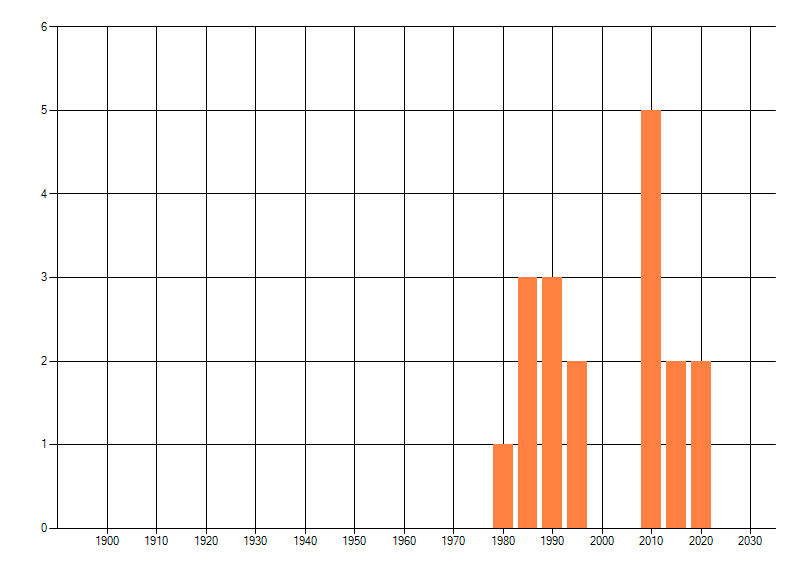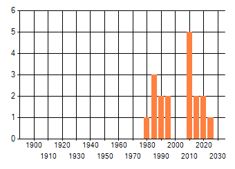 Het aantal atlasblokken (5x5 km) waarin de soort is gemeld binnen een periode van vijf jaar (vanaf 1980) of twintig jaar. Niet gecorrigeerd voor waarnemersinspanning en het aantal doorgegeven waarnemingen kan sterk variëren per periode, dus een trend in verspreiding kan hier niet direct uit worden afgelezen. Het opgegeven jaartal is het eerste jaar van de periode. Bron: gevalideerde waarnemingen uit de NDFF.