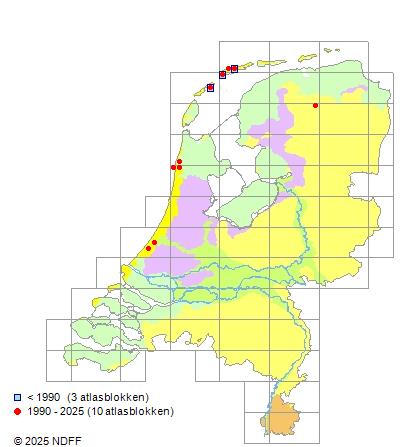 Zeer zeld., in W (Terschelling, Hoorn; Vlieland, Rug van het Veen; Terschelling, Grieltjeplak), éénmaal gemeld uit het binnenland (Middelbeers, N.Br.).