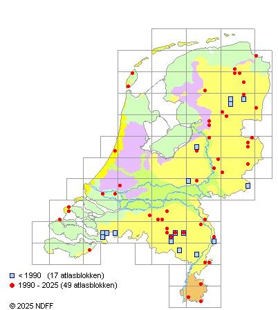 Het aantal atlasblokken (5x5 km) waarin de soort is gemeld binnen een periode van vijf jaar (vanaf 1980) of twintig jaar. Niet gecorrigeerd voor waarnemersinspanning en het aantal doorgegeven waarnemingen kan sterk variëren per periode, dus een trend in verspreiding kan hier niet direct uit worden afgelezen. Het opgegeven jaartal is het eerste jaar van de periode. Bron: gevalideerde waarnemingen uit de NDFF.