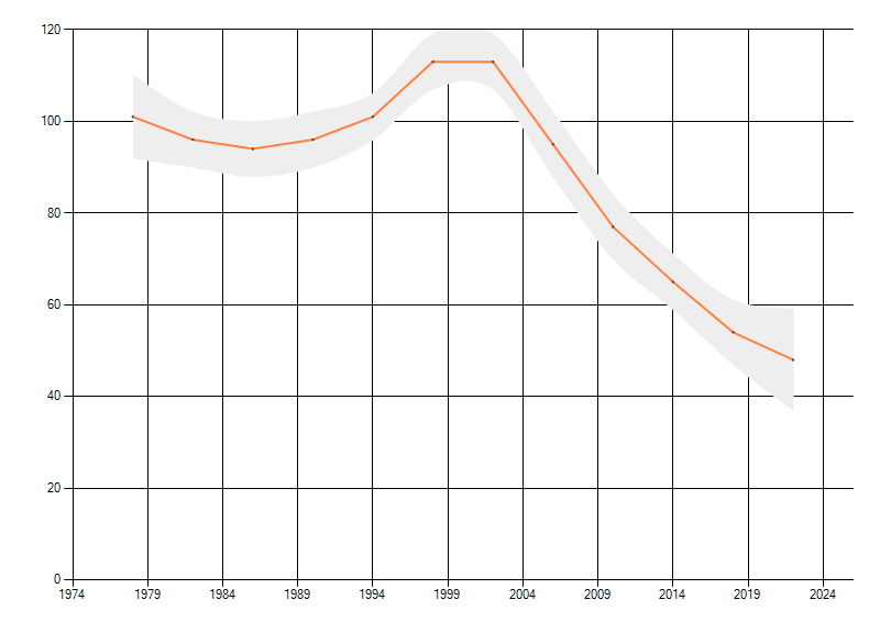 Gemiddelde trend van het aantal kilometerhokken waarin de soort voorkomt, weergegeven als indexcijfer (1975-1978 = 100). De trend is gecorrigeerd voor waarnemersinspanning en geeft de relatieve verandering in het aantal bezette kilometerhokken weer. Voor de berekening worden de data per periode van vier jaar samengenomen. In de grafiek correspondeert ieder punt met het laatste jaar van zo'n periode.