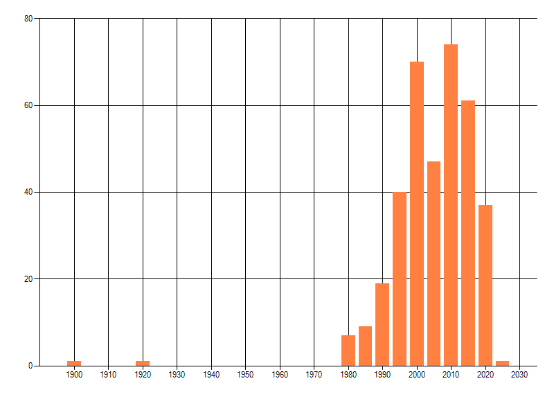 Het aantal atlasblokken (5x5 km) waarin de soort is gemeld binnen een periode van vijf jaar (vanaf 1980) of twintig jaar. Niet gecorrigeerd voor waarnemersinspanning en het aantal doorgegeven waarnemingen kan sterk variëren per periode, dus een trend in verspreiding kan hier niet direct uit worden afgelezen. Het opgegeven jaartal is het eerste jaar van de periode. Bron: gevalideerde waarnemingen uit de NDFF.