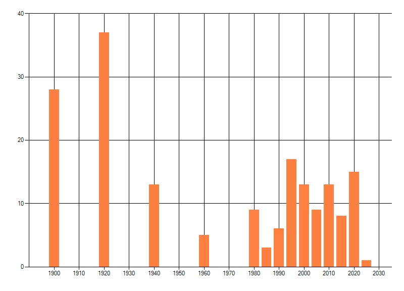 Het aantal atlasblokken (5x5 km) waarin de soort is gemeld binnen een periode van vijf jaar (vanaf 1980) of twintig jaar. Niet gecorrigeerd voor waarnemersinspanning en het aantal doorgegeven waarnemingen kan sterk variëren per periode, dus een trend in verspreiding kan hier niet direct uit worden afgelezen. Het opgegeven jaartal is het eerste jaar van de periode. Bron: gevalideerde waarnemingen uit de NDFF.