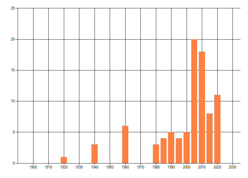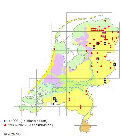 Het aantal atlasblokken (5x5 km) waarin de soort is gemeld binnen een periode van vijf jaar (vanaf 1980) of twintig jaar. Niet gecorrigeerd voor waarnemersinspanning en het aantal doorgegeven waarnemingen kan sterk variëren per periode, dus een trend in verspreiding kan hier niet direct uit worden afgelezen. Het opgegeven jaartal is het eerste jaar van de periode. Bron: gevalideerde waarnemingen uit de NDFF.