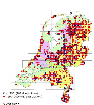 Het aantal atlasblokken (5x5 km) waarin de soort is gemeld binnen een periode van vijf jaar (vanaf 1980) of twintig jaar. Niet gecorrigeerd voor waarnemersinspanning en het aantal doorgegeven waarnemingen kan sterk variëren per periode, dus een trend in verspreiding kan hier niet direct uit worden afgelezen. Het opgegeven jaartal is het eerste jaar van de periode. Bron: gevalideerde waarnemingen uit de NDFF.