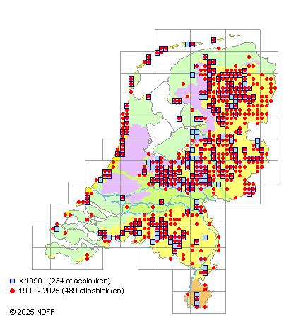 Vrij alg.; vooral in R, W en P, elders zeld. of ontbrekend. Sterk achteruitgaand in de laatste decennia. Kaart in Nauta & Vellinga, Atlas 1995.