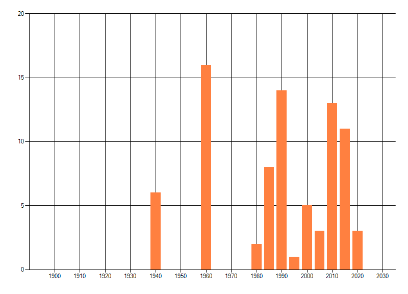 Het aantal atlasblokken (5x5 km) waarin de soort is gemeld binnen een periode van vijf jaar (vanaf 1980) of twintig jaar. Niet gecorrigeerd voor waarnemersinspanning en het aantal doorgegeven waarnemingen kan sterk variëren per periode, dus een trend in verspreiding kan hier niet direct uit worden afgelezen. Het opgegeven jaartal is het eerste jaar van de periode. Bron: gevalideerde waarnemingen uit de NDFF.