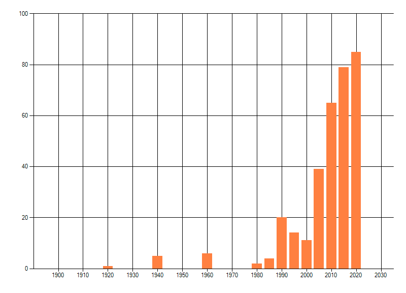 Het aantal atlasblokken (5x5 km) waarin de soort is gemeld binnen een periode van vijf jaar (vanaf 1980) of twintig jaar. Niet gecorrigeerd voor waarnemersinspanning en het aantal doorgegeven waarnemingen kan sterk variëren per periode, dus een trend in verspreiding kan hier niet direct uit worden afgelezen. Het opgegeven jaartal is het eerste jaar van de periode. Bron: gevalideerde waarnemingen uit de NDFF.