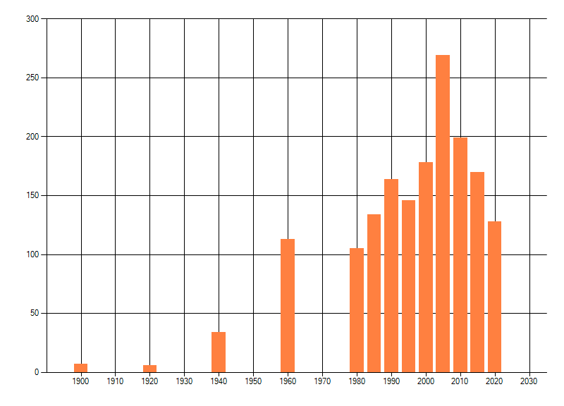 Het aantal atlasblokken (5x5 km) waarin de soort is gemeld binnen een periode van vijf jaar (vanaf 1980) of twintig jaar. Niet gecorrigeerd voor waarnemersinspanning en het aantal doorgegeven waarnemingen kan sterk variëren per periode, dus een trend in verspreiding kan hier niet direct uit worden afgelezen. Het opgegeven jaartal is het eerste jaar van de periode. Bron: gevalideerde waarnemingen uit de NDFF.