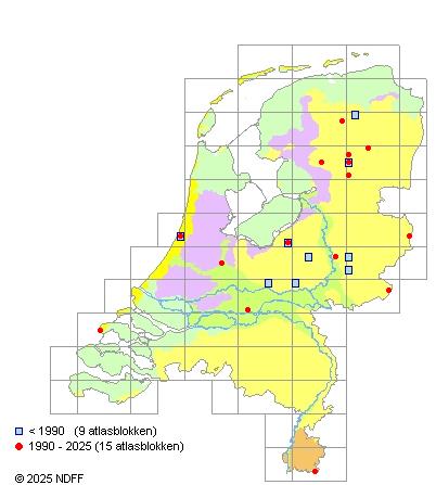 Het aantal atlasblokken (5x5 km) waarin de soort is gemeld binnen een periode van vijf jaar (vanaf 1980) of twintig jaar. Niet gecorrigeerd voor waarnemersinspanning en het aantal doorgegeven waarnemingen kan sterk variëren per periode, dus een trend in verspreiding kan hier niet direct uit worden afgelezen. Het opgegeven jaartal is het eerste jaar van de periode. Bron: gevalideerde waarnemingen uit de NDFF.