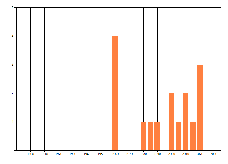 Het aantal atlasblokken (5x5 km) waarin de soort is gemeld binnen een periode van vijf jaar (vanaf 1980) of twintig jaar. Niet gecorrigeerd voor waarnemersinspanning en het aantal doorgegeven waarnemingen kan sterk variëren per periode, dus een trend in verspreiding kan hier niet direct uit worden afgelezen. Het opgegeven jaartal is het eerste jaar van de periode. Bron: gevalideerde waarnemingen uit de NDFF.