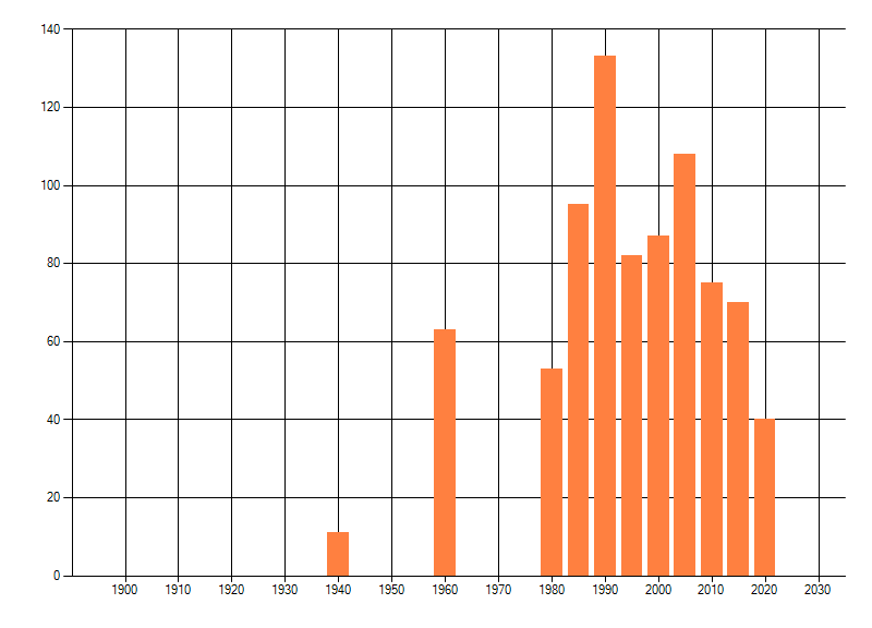 Het aantal atlasblokken (5x5 km) waarin de soort is gemeld binnen een periode van vijf jaar (vanaf 1980) of twintig jaar. Niet gecorrigeerd voor waarnemersinspanning en het aantal doorgegeven waarnemingen kan sterk variëren per periode, dus een trend in verspreiding kan hier niet direct uit worden afgelezen. Het opgegeven jaartal is het eerste jaar van de periode. Bron: gevalideerde waarnemingen uit de NDFF.