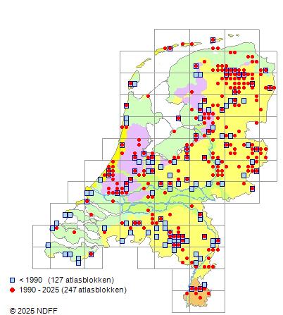 Het aantal atlasblokken (5x5 km) waarin de soort is gemeld binnen een periode van vijf jaar (vanaf 1980) of twintig jaar. Niet gecorrigeerd voor waarnemersinspanning en het aantal doorgegeven waarnemingen kan sterk variëren per periode, dus een trend in verspreiding kan hier niet direct uit worden afgelezen. Het opgegeven jaartal is het eerste jaar van de periode. Bron: gevalideerde waarnemingen uit de NDFF.