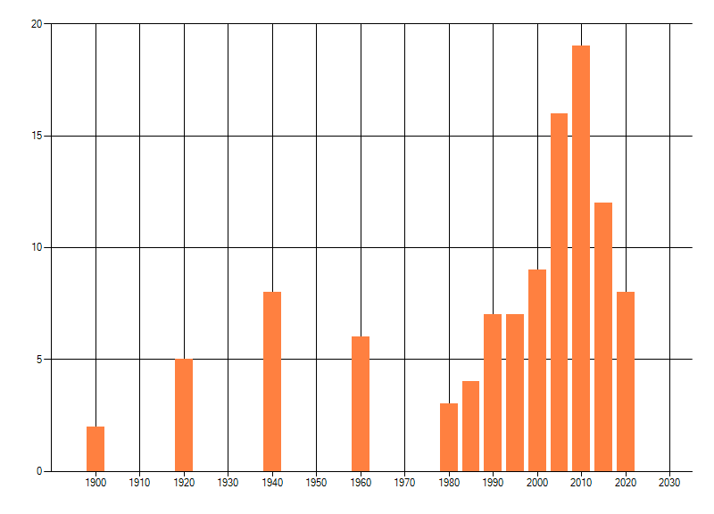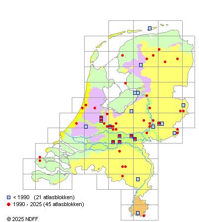 Het aantal atlasblokken (5x5 km) waarin de soort is gemeld binnen een periode van vijf jaar (vanaf 1980) of twintig jaar. Niet gecorrigeerd voor waarnemersinspanning en het aantal doorgegeven waarnemingen kan sterk variëren per periode, dus een trend in verspreiding kan hier niet direct uit worden afgelezen. Het opgegeven jaartal is het eerste jaar van de periode. Bron: gevalideerde waarnemingen uit de NDFF.