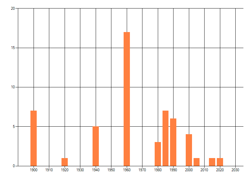 Het aantal atlasblokken (5x5 km) waarin de soort is gemeld binnen een periode van vijf jaar (vanaf 1980) of twintig jaar. Niet gecorrigeerd voor waarnemersinspanning en het aantal doorgegeven waarnemingen kan sterk variëren per periode, dus een trend in verspreiding kan hier niet direct uit worden afgelezen. Het opgegeven jaartal is het eerste jaar van de periode. Bron: gevalideerde waarnemingen uit de NDFF.