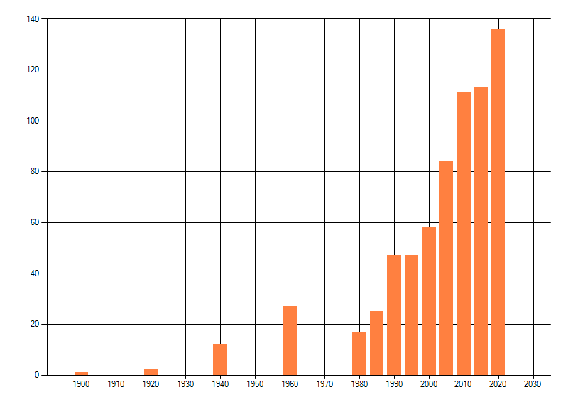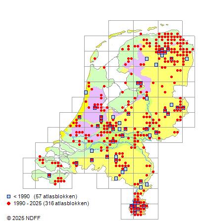 Het aantal atlasblokken (5x5 km) waarin de soort is gemeld binnen een periode van vijf jaar (vanaf 1980) of twintig jaar. Niet gecorrigeerd voor waarnemersinspanning en het aantal doorgegeven waarnemingen kan sterk variëren per periode, dus een trend in verspreiding kan hier niet direct uit worden afgelezen. Het opgegeven jaartal is het eerste jaar van de periode. Bron: gevalideerde waarnemingen uit de NDFF.