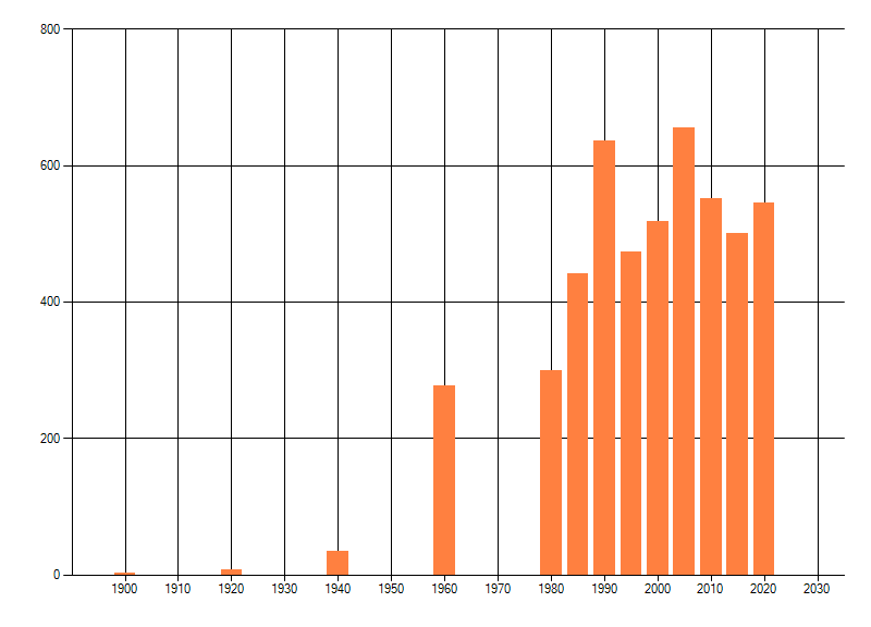 Het aantal atlasblokken (5x5 km) waarin de soort is gemeld binnen een periode van vijf jaar (vanaf 1980) of twintig jaar. Niet gecorrigeerd voor waarnemersinspanning en het aantal doorgegeven waarnemingen kan sterk variëren per periode, dus een trend in verspreiding kan hier niet direct uit worden afgelezen. Het opgegeven jaartal is het eerste jaar van de periode. Bron: gevalideerde waarnemingen uit de NDFF.