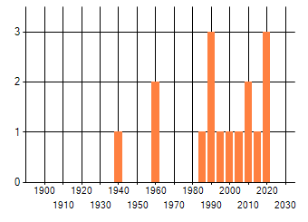 Het aantal atlasblokken (5x5 km) waarin de soort is gemeld binnen een periode van vijf jaar (vanaf 1980) of twintig jaar. Niet gecorrigeerd voor waarnemersinspanning en het aantal doorgegeven waarnemingen kan sterk variëren per periode, dus een trend in verspreiding kan hier niet direct uit worden afgelezen. Het opgegeven jaartal is het eerste jaar van de periode. Bron: gevalideerde waarnemingen uit de NDFF.