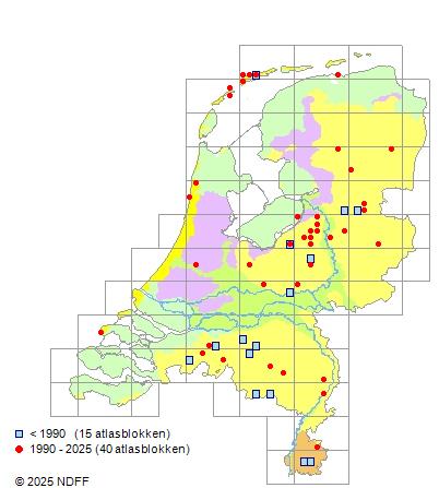 Het aantal atlasblokken (5x5 km) waarin de soort is gemeld binnen een periode van vijf jaar (vanaf 1980) of twintig jaar. Niet gecorrigeerd voor waarnemersinspanning en het aantal doorgegeven waarnemingen kan sterk variëren per periode, dus een trend in verspreiding kan hier niet direct uit worden afgelezen. Het opgegeven jaartal is het eerste jaar van de periode. Bron: gevalideerde waarnemingen uit de NDFF.