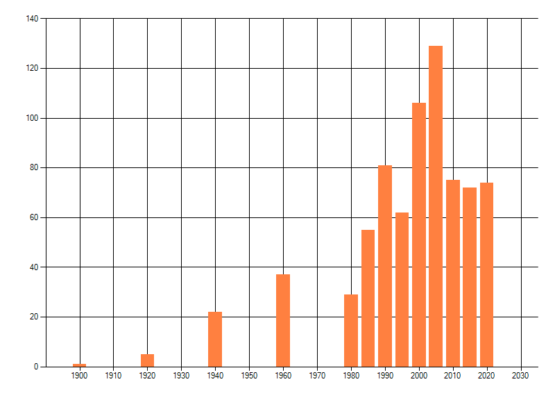 Het aantal atlasblokken (5x5 km) waarin de soort is gemeld binnen een periode van vijf jaar (vanaf 1980) of twintig jaar. Niet gecorrigeerd voor waarnemersinspanning en het aantal doorgegeven waarnemingen kan sterk variëren per periode, dus een trend in verspreiding kan hier niet direct uit worden afgelezen. Het opgegeven jaartal is het eerste jaar van de periode. Bron: gevalideerde waarnemingen uit de NDFF.