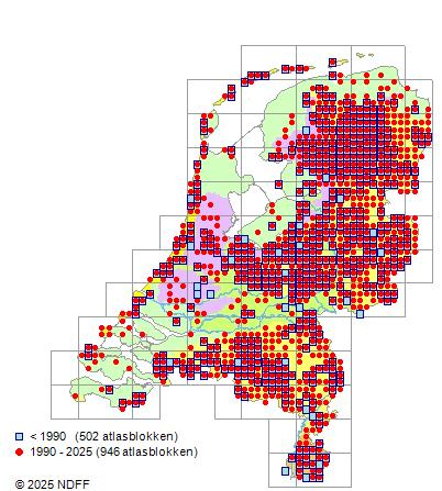 Het aantal atlasblokken (5x5 km) waarin de soort is gemeld binnen een periode van vijf jaar (vanaf 1980) of twintig jaar. Niet gecorrigeerd voor waarnemersinspanning en het aantal doorgegeven waarnemingen kan sterk variëren per periode, dus een trend in verspreiding kan hier niet direct uit worden afgelezen. Het opgegeven jaartal is het eerste jaar van de periode. Bron: gevalideerde waarnemingen uit de NDFF.