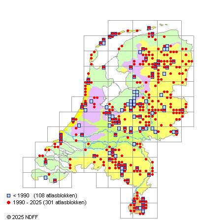 Het aantal atlasblokken (5x5 km) waarin de soort is gemeld binnen een periode van vijf jaar (vanaf 1980) of twintig jaar. Niet gecorrigeerd voor waarnemersinspanning en het aantal doorgegeven waarnemingen kan sterk variëren per periode, dus een trend in verspreiding kan hier niet direct uit worden afgelezen. Het opgegeven jaartal is het eerste jaar van de periode. Bron: gevalideerde waarnemingen uit de NDFF.