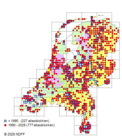 Het aantal atlasblokken (5x5 km) waarin de soort is gemeld binnen een periode van vijf jaar (vanaf 1980) of twintig jaar. Niet gecorrigeerd voor waarnemersinspanning en het aantal doorgegeven waarnemingen kan sterk variëren per periode, dus een trend in verspreiding kan hier niet direct uit worden afgelezen. Het opgegeven jaartal is het eerste jaar van de periode. Bron: gevalideerde waarnemingen uit de NDFF.