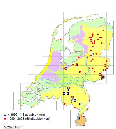 Het aantal atlasblokken (5x5 km) waarin de soort is gemeld binnen een periode van vijf jaar (vanaf 1980) of twintig jaar. Niet gecorrigeerd voor waarnemersinspanning en het aantal doorgegeven waarnemingen kan sterk variëren per periode, dus een trend in verspreiding kan hier niet direct uit worden afgelezen. Het opgegeven jaartal is het eerste jaar van de periode. Bron: gevalideerde waarnemingen uit de NDFF.