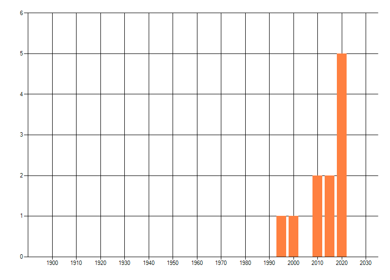 Het aantal atlasblokken (5x5 km) waarin de soort is gemeld binnen een periode van vijf jaar (vanaf 1980) of twintig jaar. Niet gecorrigeerd voor waarnemersinspanning en het aantal doorgegeven waarnemingen kan sterk variëren per periode, dus een trend in verspreiding kan hier niet direct uit worden afgelezen. Het opgegeven jaartal is het eerste jaar van de periode. Bron: gevalideerde waarnemingen uit de NDFF.