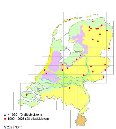 Het aantal atlasblokken (5x5 km) waarin de soort is gemeld binnen een periode van vijf jaar (vanaf 1980) of twintig jaar. Niet gecorrigeerd voor waarnemersinspanning en het aantal doorgegeven waarnemingen kan sterk variëren per periode, dus een trend in verspreiding kan hier niet direct uit worden afgelezen. Het opgegeven jaartal is het eerste jaar van de periode. Bron: gevalideerde waarnemingen uit de NDFF.